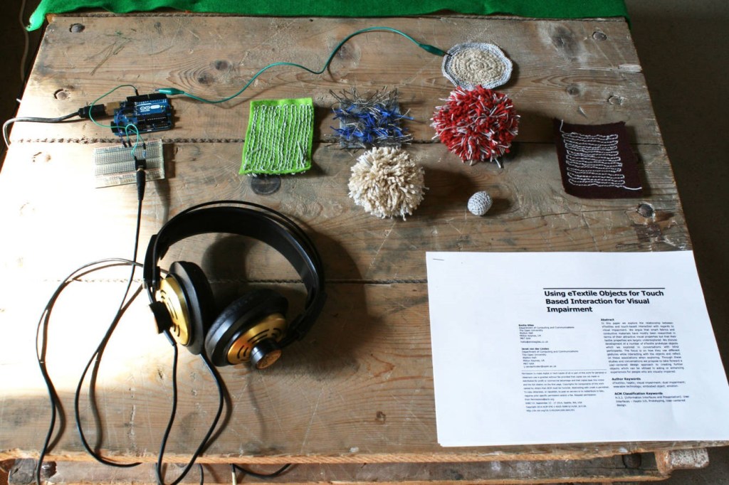 My name is Emilie Giles – I generally describe myself as an artist/ researcher/ producer. I’m currently working on a PhD with the Open University exploring how e-textiles (electronic textiles) can be used as tangible tools for blind and visually impaired people, and also how they can make their own personalised interactive art pieces using crafting methods.